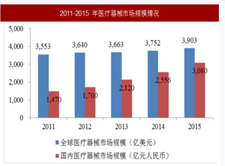醫(yī)療器械是醫(yī)療衛(wèi)生體系建設的重要基礎,醫(yī)療器械產業(yè)具有高度戰(zhàn)略性、帶動性和成長性,其戰(zhàn)略地位受到世界各國的普遍重視,已經成為一個國家科技進步和國民經濟水平的重要標志,并成為當今世界貿易往來最為活躍的產業(yè)之一。根據 EvaluateMedTech 的統(tǒng)計數字,2015 年全球醫(yī)療器械市場規(guī)模達到 3,903億美元,較 2011 年增長了 350 億美元,2011-2015 年復合增長率僅為 2.38%;而2015 年我國醫(yī)療器械市場規(guī)模為 3,080 億元人民幣,2011-2015 年復合增長率達到 20.31%,遠超全球增速。與此同時,該機構預測 2020 年全球醫(yī)療器械市場規(guī)模將增長到 4,775 億美元,2015-2020 年全球復合增長率約為 4.12%,預計增長持續(xù)平穩(wěn)。(見下表)