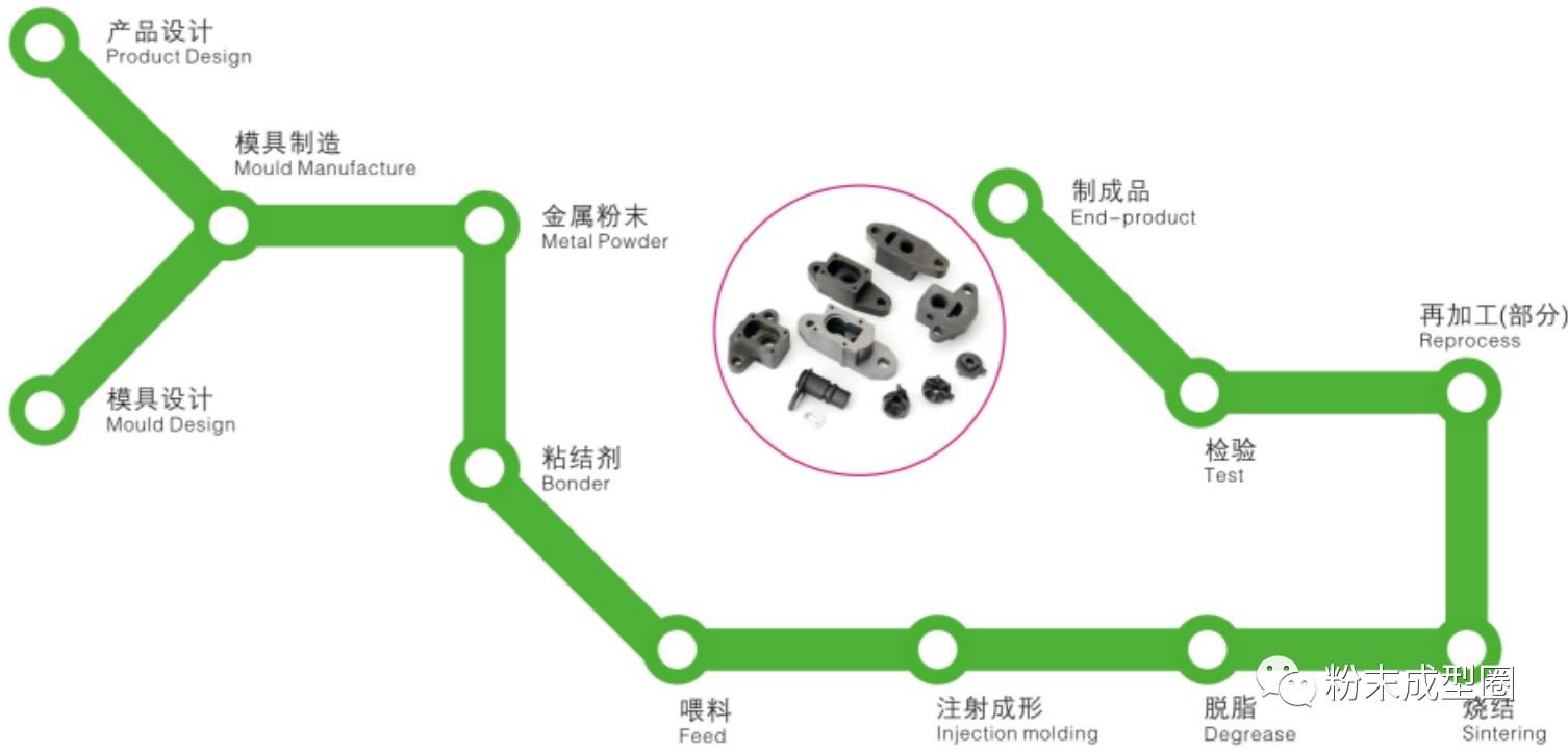 粉末注射成形是冶金和材料科學的一個分支,該工藝主要以金屬粉末(包括混入少量非金屬粉末)為原料,用“成形+燒結”的方法制造材料與制品,是一種以較低成本生產復雜零部件的近凈成形的工藝。根據材料的分類,可將粉末注射成形劃分為 MIM(Metal Injection Molding,金屬注射成形)和 CIM(CeramicInjection Molding,陶瓷注射成形)兩大類別。